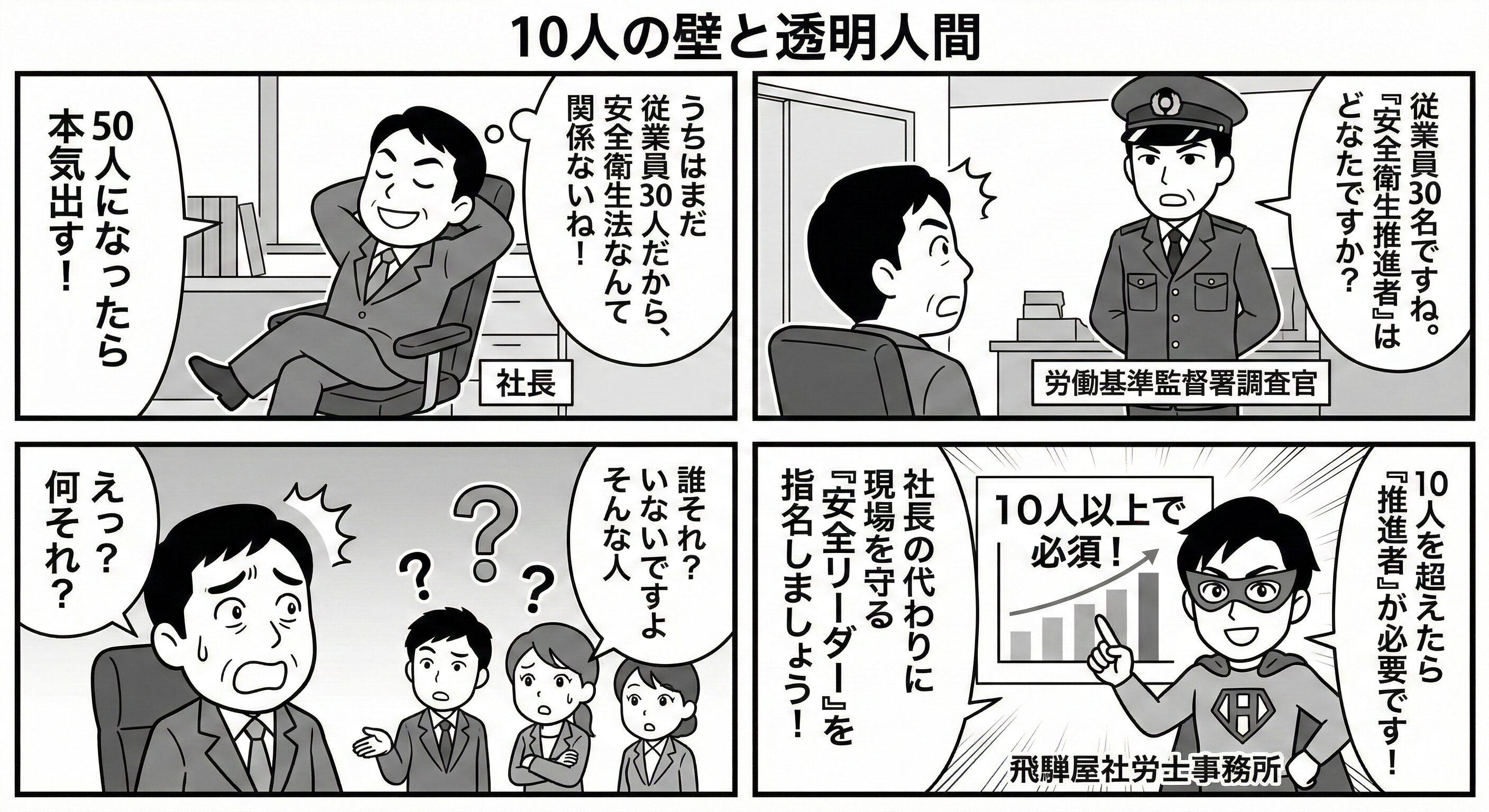 従業員10人〜49人の規模は、社長の目が届きにくくなり始める時期です。 社長一人で全員の安全と健康を見るのは不可能です。