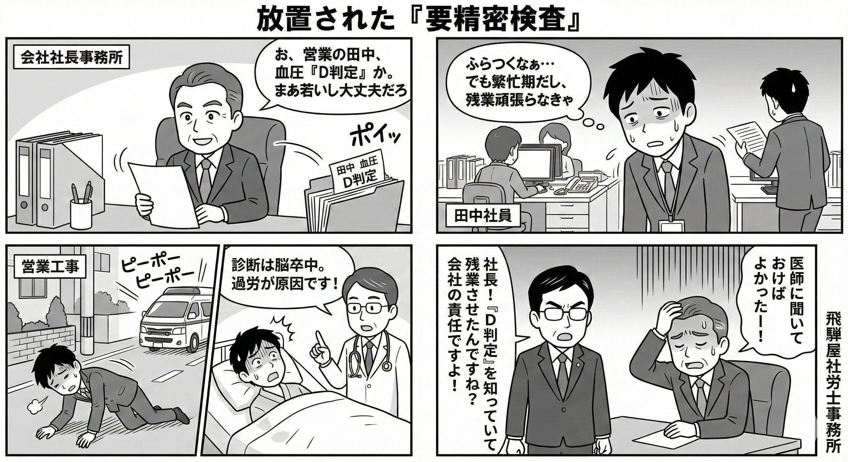 例えば、血圧が危険な数値の社員に、医師の意見を聞かずに「残業」をさせ続け、もし脳出血で倒れたら…。 会社は**「予見できたのに防がなかった」**として、安全配慮義務違反を問われます。