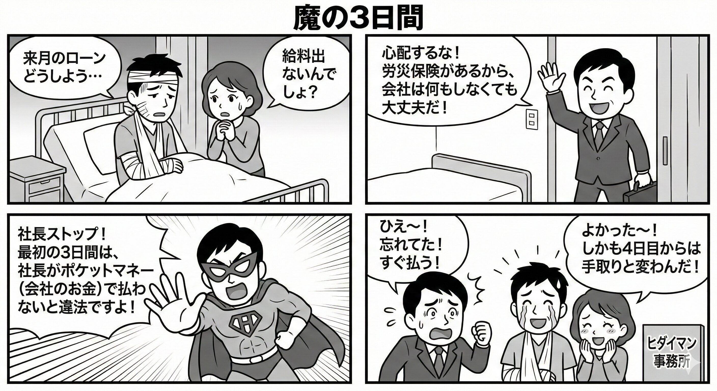 「労災保険に入ってるから、国からお金が出るよ! 安心しな!」 と答えた社長、90点です。 実は、最初の3日間については、国の保険は使えず、会社が自腹で払わなければならないことをご存知でしょうか?