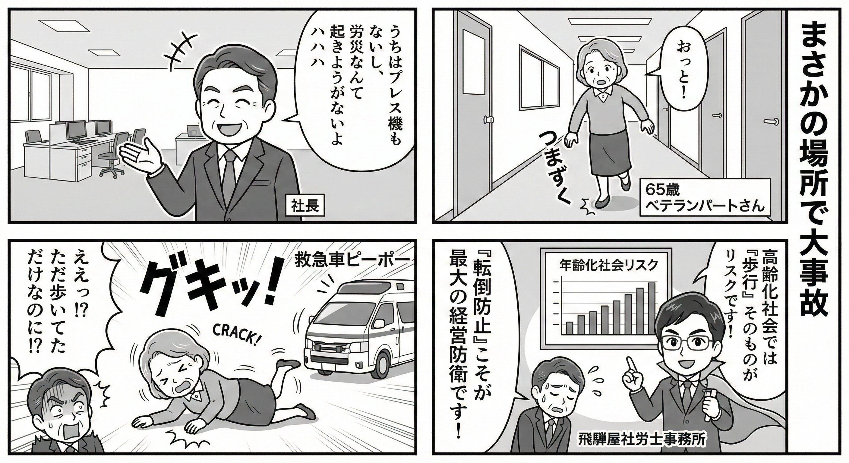 社長、「ベテランだから足元も気をつけているだろう」は過信です。 身体機能の低下は、本人の意思ではどうにもなりません。 **「段差をなくす」「手すりをつける」「靴を見直す」**といった、ハード面での対策が急務です。