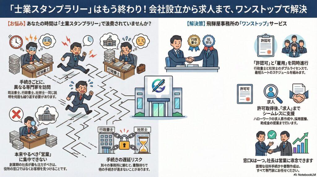 【起業家の皆様へ】あちこちの事務所を回る「スタンプラリー」は今日で終わり。設立・許可・求人まで、全部ここで完結します。